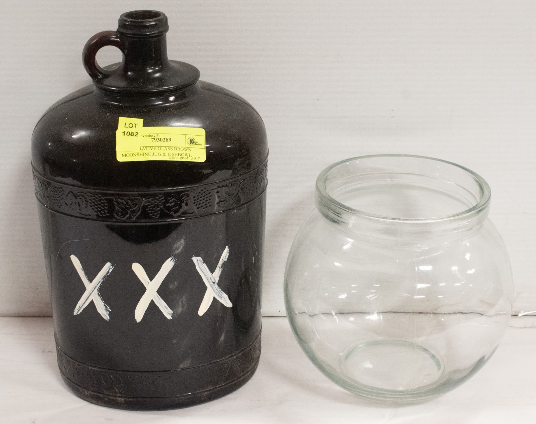 2 DECORATIVE GLASS BROWN MOONSHINE JUG & FISHBOWL