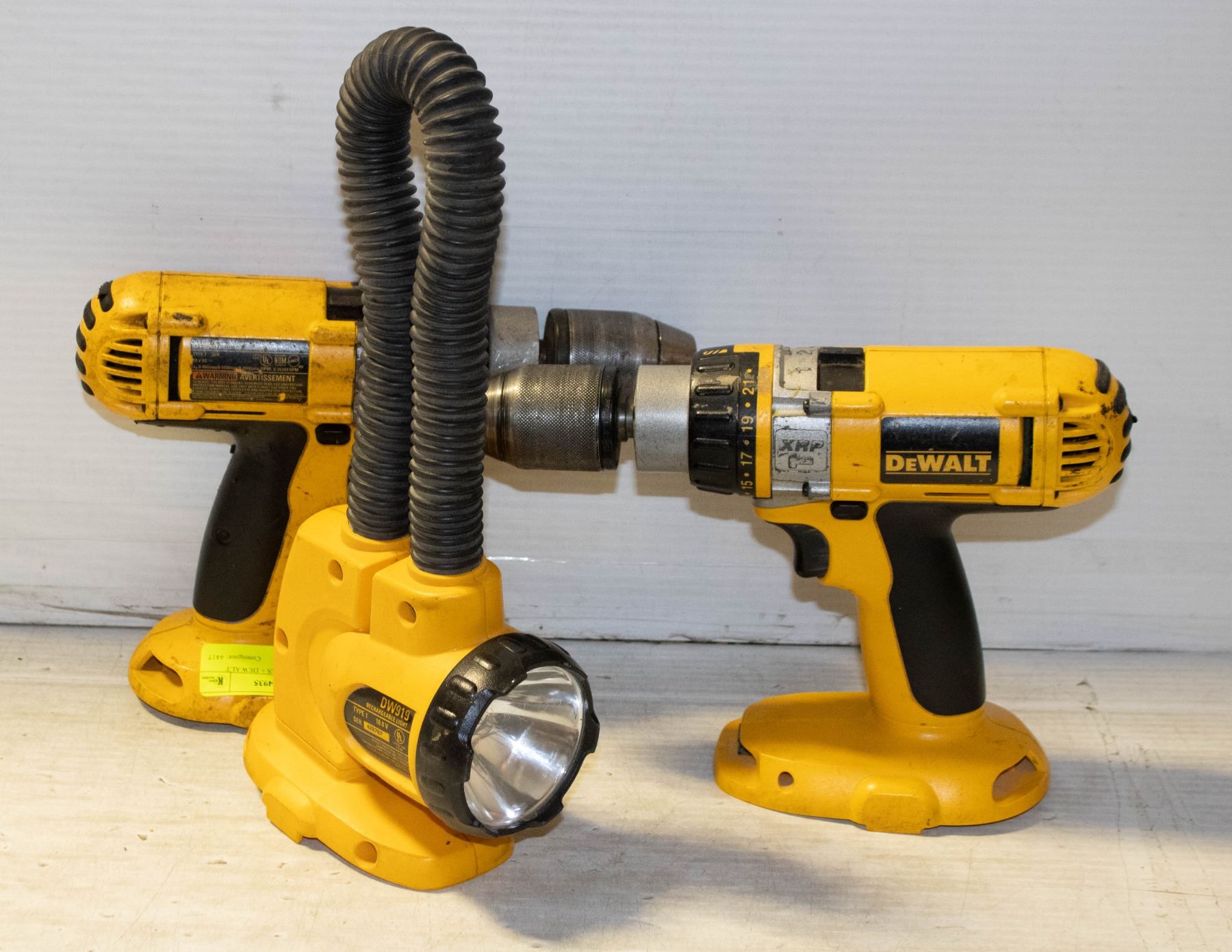 2 DEWALT DRILLS + DEWALT FLASHLIGHT