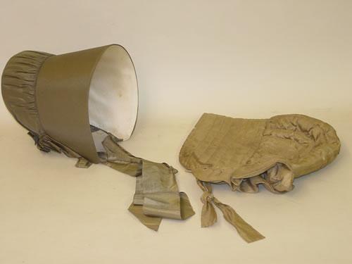 (2) DIFFERENT 19TH CENT. LADIES HAND SEWN SILK BONNETS: (1) GREEN STIFF HOODED BONNET W/ BOWED BACK (APPROX. 8 1/2" X 9 1/2") & (1) TAN QUILTED BONNET W/ RUFFLED BACK (APPROX. 12" X 12") - BOTH W/ STAINS, DAMAGE, REPLACEMENTS, IMPERFECTIONS