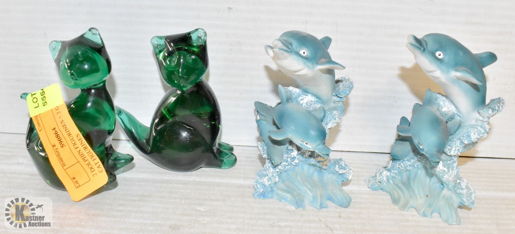 2 DOLPHIN FIGURINES + 2 GLASS CAT FIGURINES