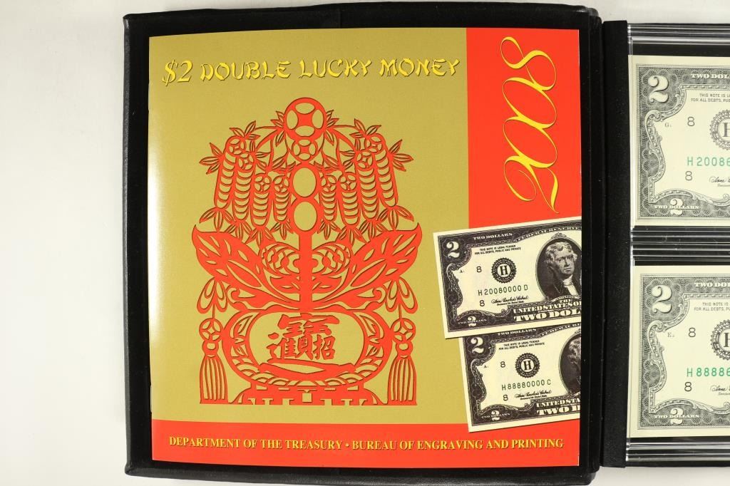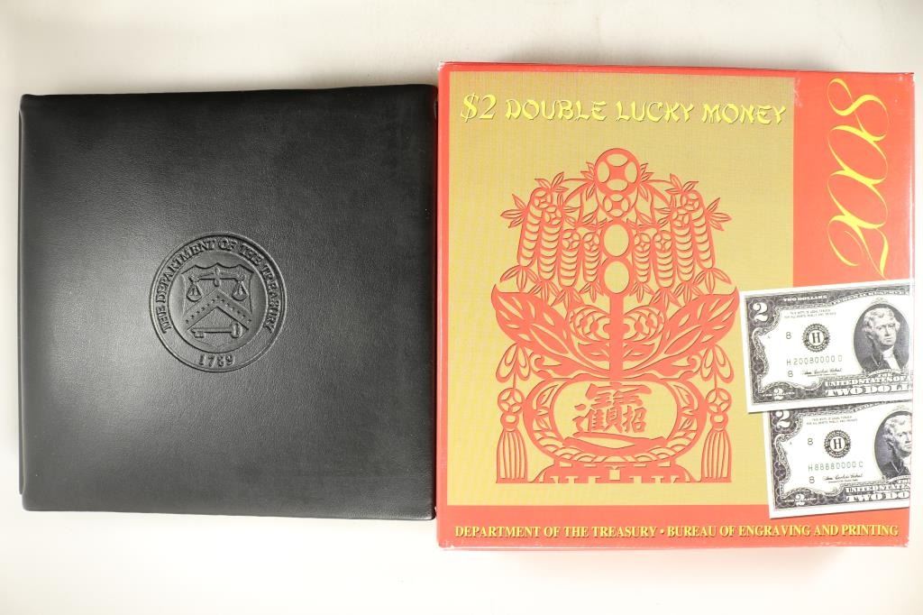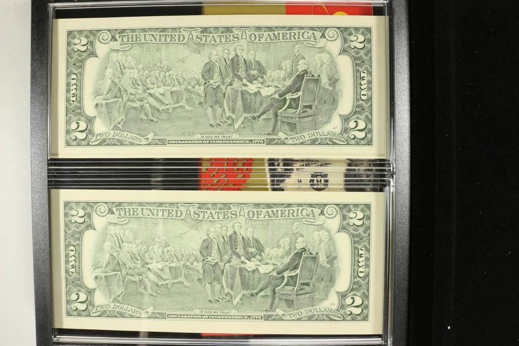 2-2003-A $2 FRN NOTES, CRISP UNC, THE 1ST ONE  STARTS WITH A SERIAL NUMBER 2008, THE 2ND  ONE STARTS WITH 8888, ORIGINAL MINT PACKAGING  BY THE BEP
