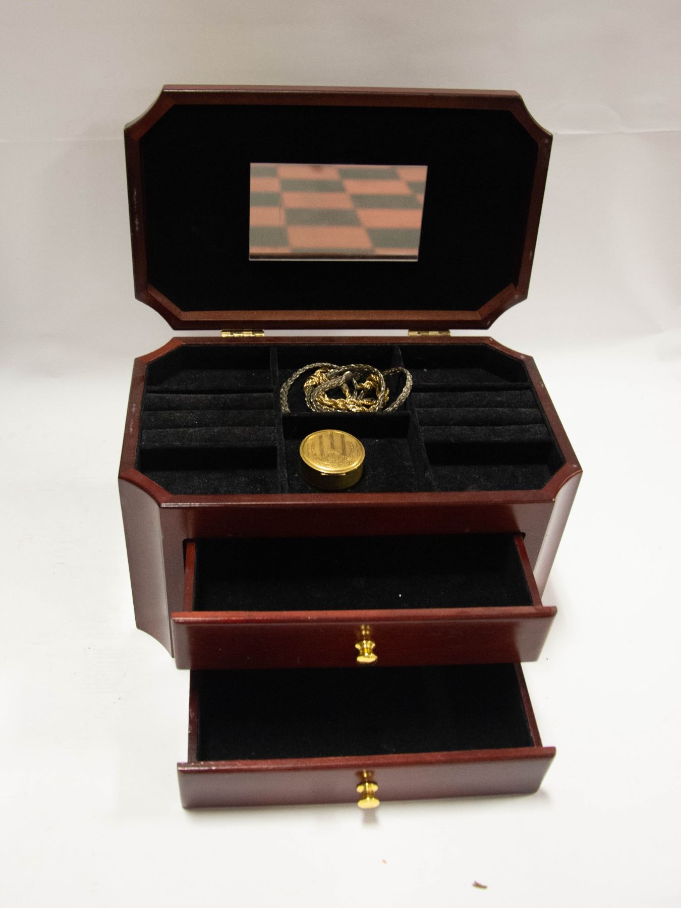 2 DRAWER WOODEN JEWELRY BOX AND 2 NECKLACES