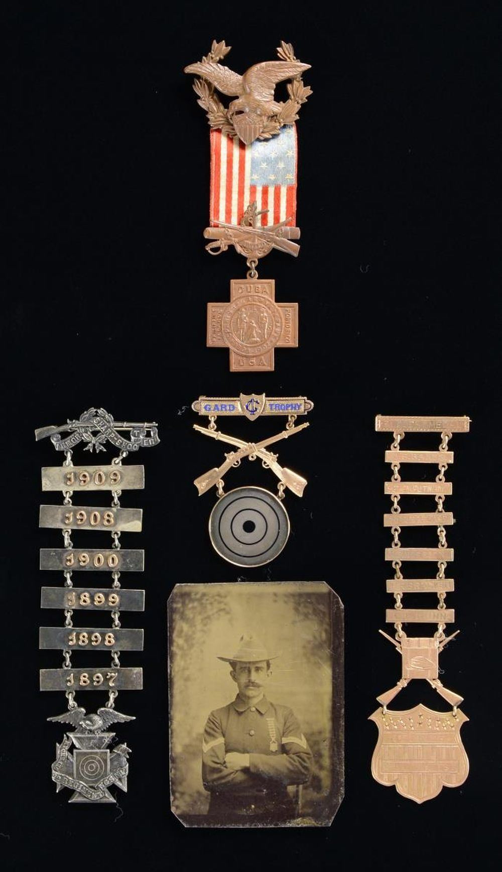 MEDAL, AND A TINTYPE. 1,2) A gold Marksmanship Medal with a top bar that reads “FULLER MEDAL” and a bottom drop in the shape of a US shield that reads “DRILL CONTEST 1st PRIZE”. There are 6 bars on this medal with different winners’ names. The back of the shield is engraved “Badger State Rifles Presented by Dr. L.L. Fuller Jan. 1st 90”. Included with this medal is a tintype of a Spanish American War Corporal wearing a 5-button uniform coat with the medal pinned to it. CONDITION: medal shows light wear but is missing one connection ring between the bars. Tintype is raw and shows some scuffs with craquelure. 3) A Marksmanship Medal in sterling silver with the top bar marked “ARMORY SHARP-SHOOTER”, and the drop is marked “DEFENDAM 22 REGIMENT N.G.S.N.Y.”. The medal has 6 bars with the dates 1897, 1898, 1899, 1900, 1908, & 1909. The reverse of the drop is marked “ROBERT STOLL N.Y. 19 JOHN ST. STERLING”. CONDITION: light wear overall. 4) A Drill Medal in silver with gold bar & crossed cannons. The bar is marked in blue enamel “GARD TROPHY” with “C1” in a shield. Below the crossed rifle is a silver target engraved on the reverse “Presented to Co. G. 1st Infantry by T.D. GARD 1885”. CONDITION: light wear. 5) A Spanish American War Veteran’s Medal with eagle bar & cross drop. The ribbon is an American flag. CONDITION: light wear overall. PROVENANCE: From the Lifelong Collection of Glen E. Mattox. (02-18569/BF). $400-600.
