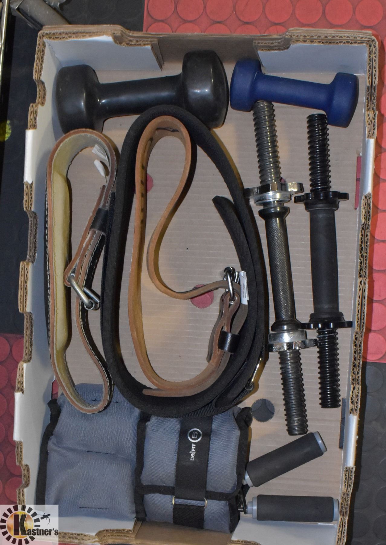 2 DUMBELL PLATE BARS, 2 DUMBELLS, BELTS, ETC.
