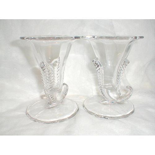 THIS SALE IS FOR 2 OF DUNCAN MILLER'S CORNUCOPIA CANDLESTICKS IN THE 3 FEATHERS PATTERN. EACH CANDLESTICK MEASURES 4 1/2 IN. TALL AND 3 1/2 IN. IN DIAMETER AND EACH IS IN WONDERFUL CONDITION WITH NO CHIPS, CRACKS, CLOUDINESS, SCRATCHES OR REPAIRS.