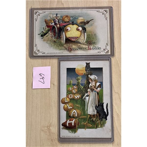 2 Winsch Halloween Witch Driving & Girl With Cat Holiday Postcards
