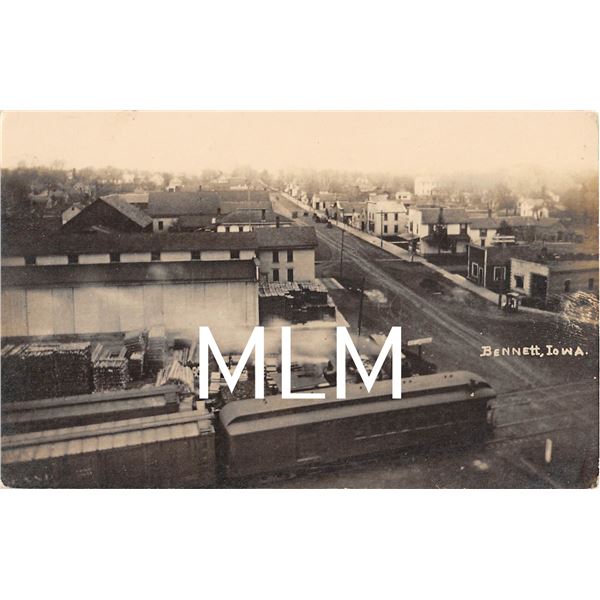 Train at Lumber Yard Depot Bennett, Iowa Photo Postcard