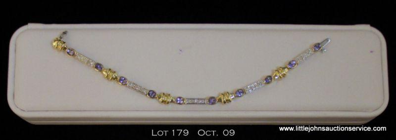 2. Dazzling 14 karat two-tone ladies Tanzanite  bracelet bezel set with 10 oval Tanzanite weighing  approx. 4.00 carats and pave set with approx.  0.50 carats in G-H color and VS/SI clarity  diamonds. Retail $5,950.00 Estimate $1,000-$1,500Featured item