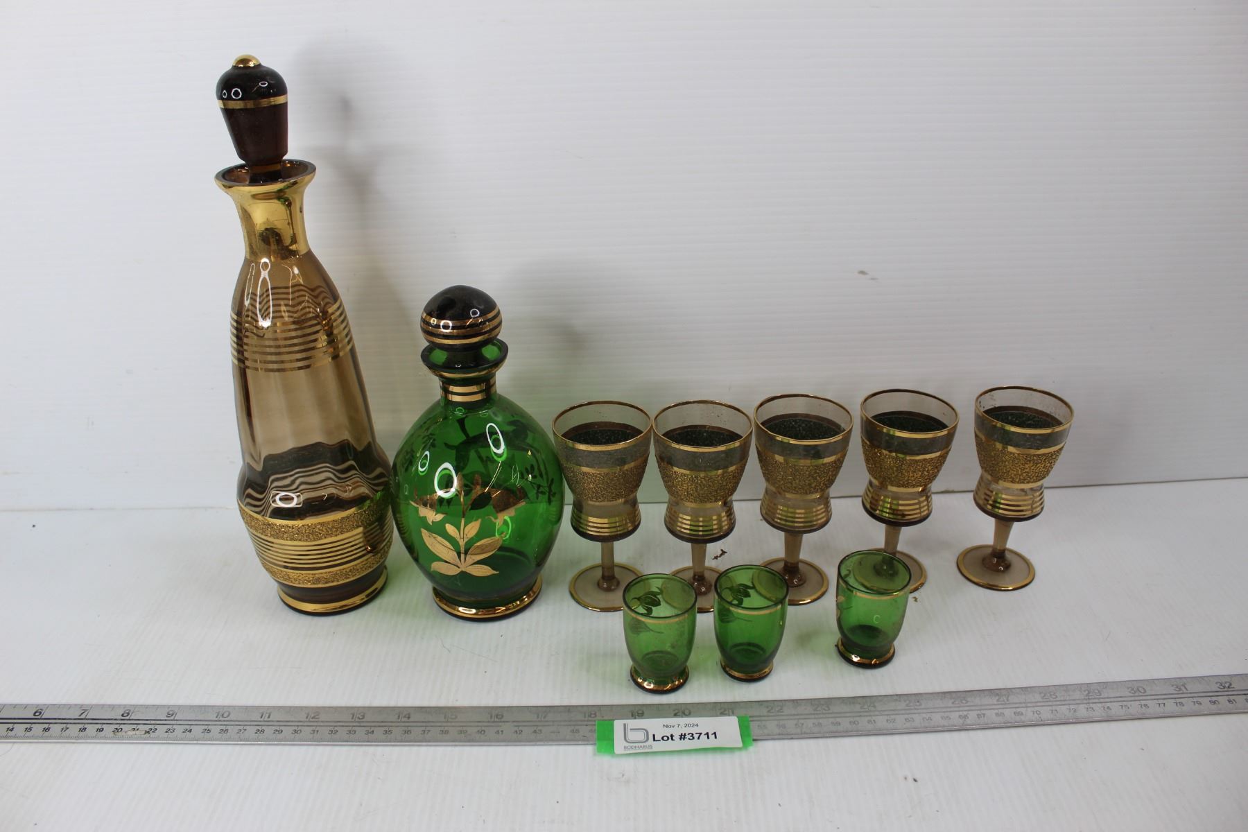 (2) Decanter Sets - Green with Gold - 3 Glasses - Smoky Glass with Gold -5 Glasses