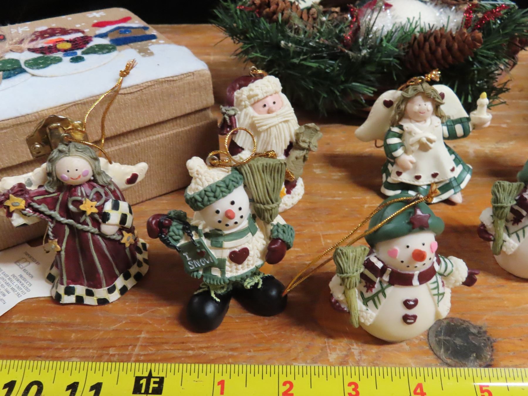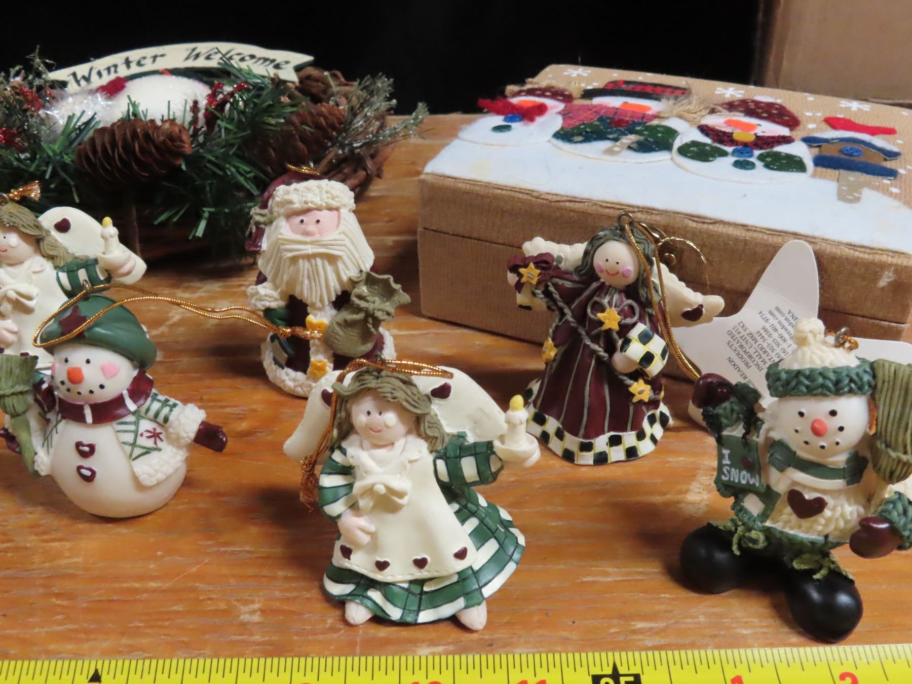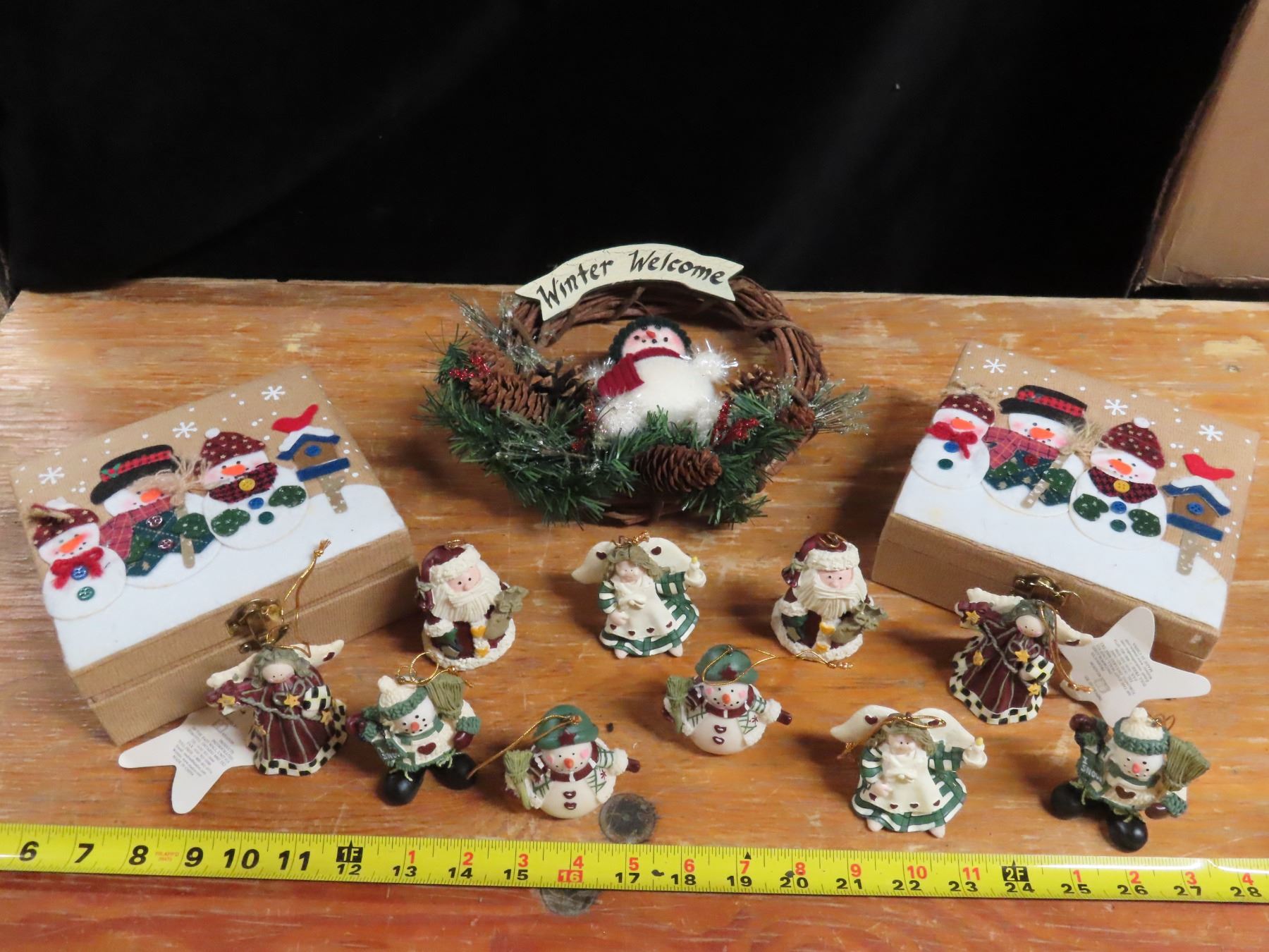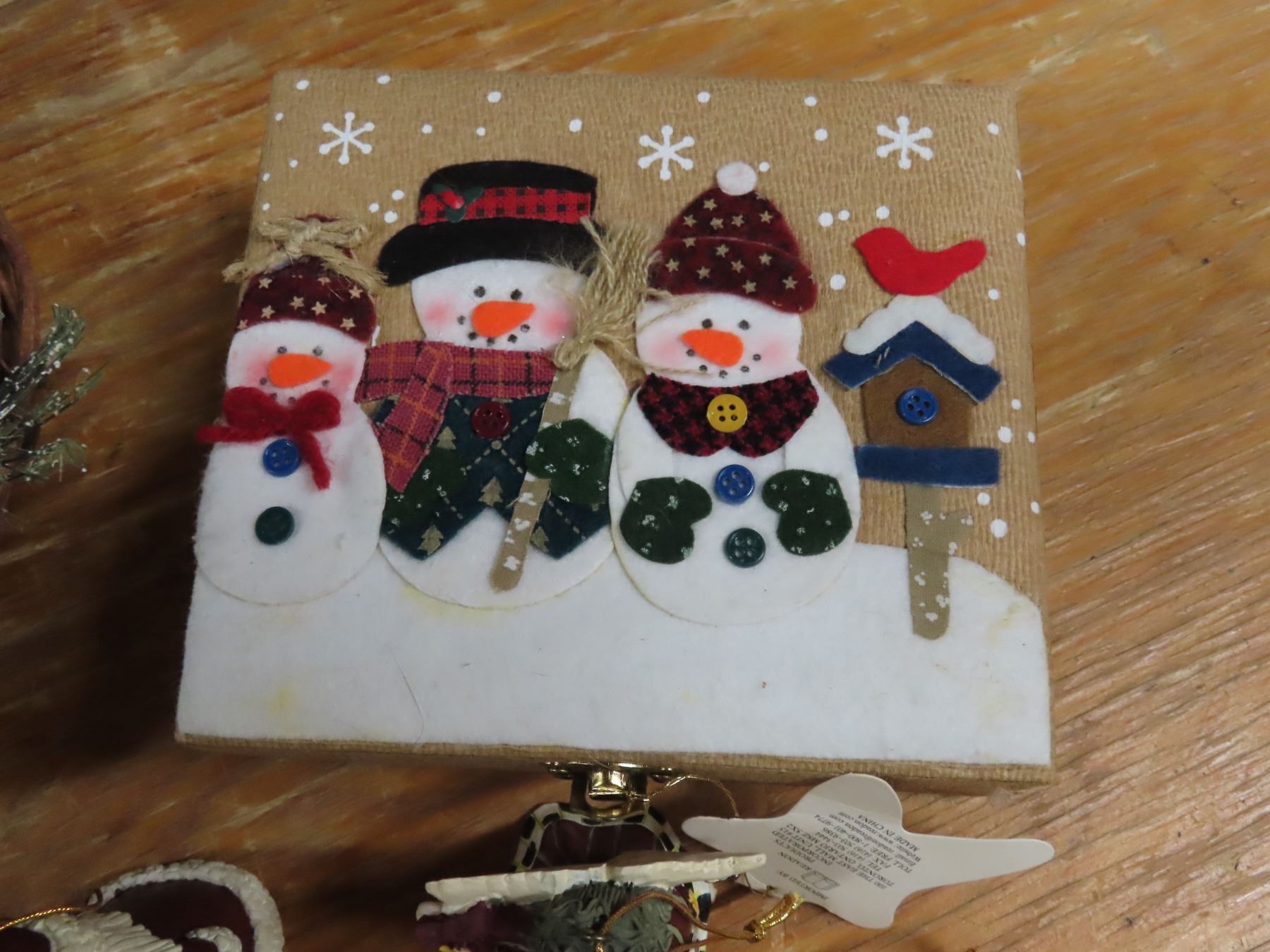 2 Decorative Boxes with 10 Handcrafted Christmas Ornaments NIB + Handcrafted Mini Snowman Wreath - cute