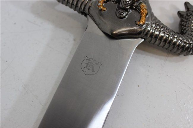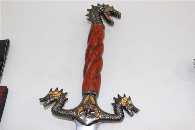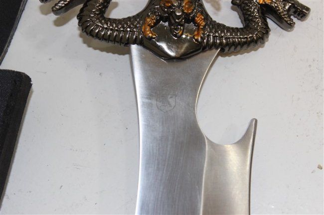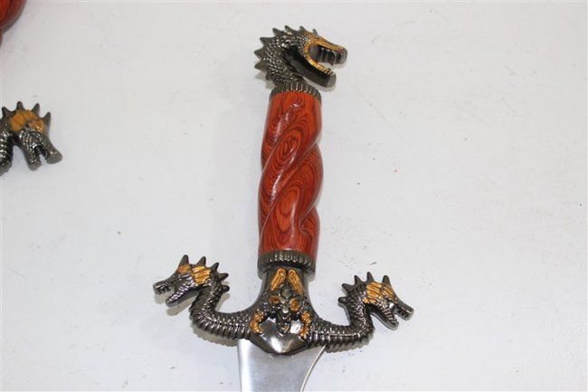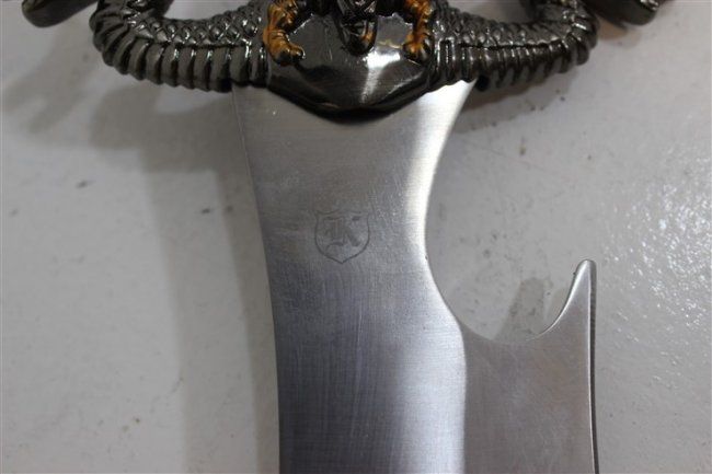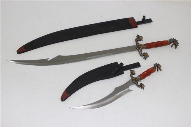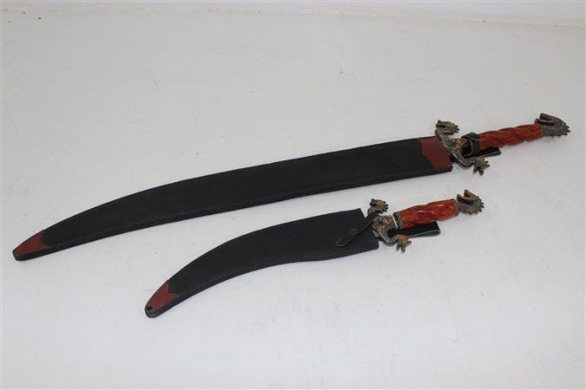 with a gut hook approx 40", curved blade approx 22", both have sheathes