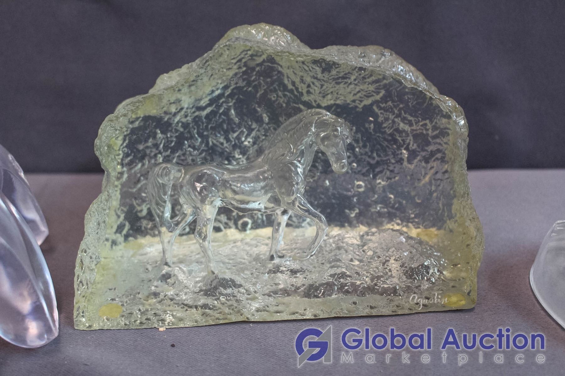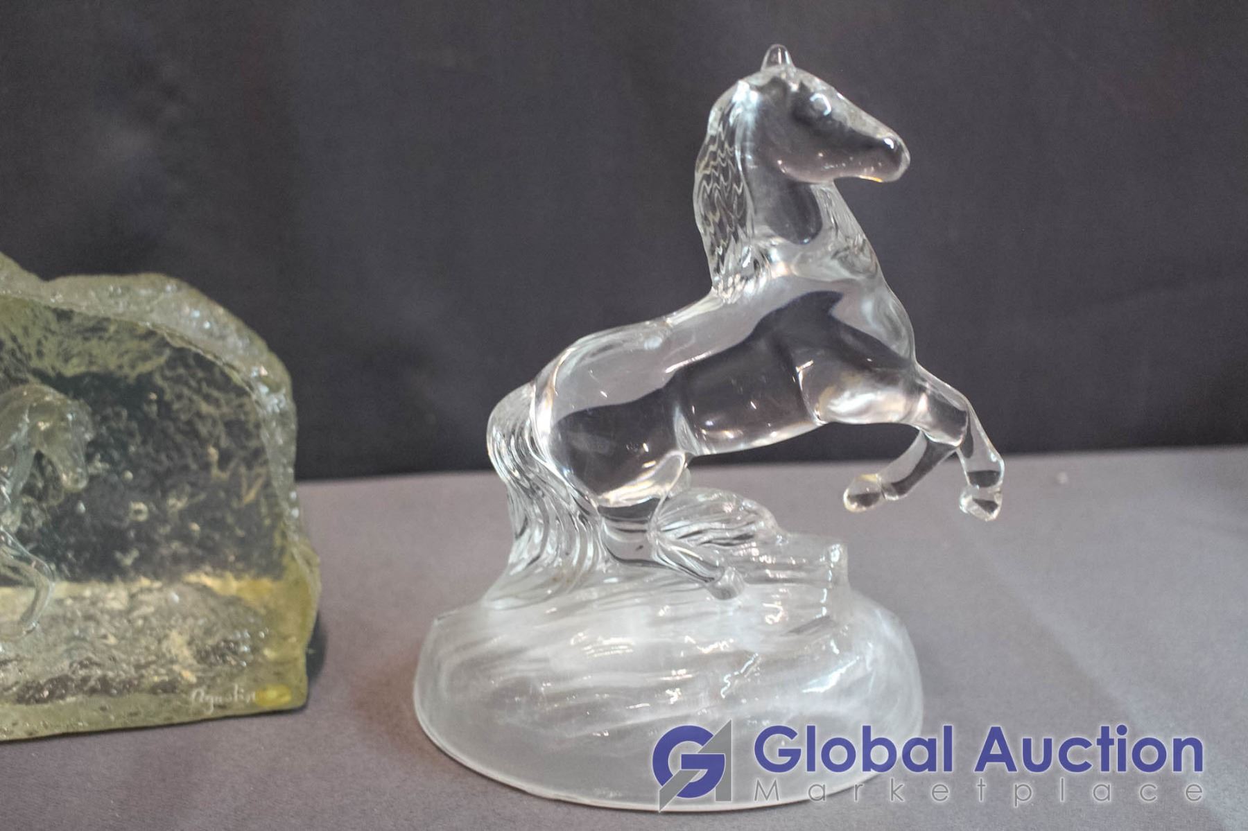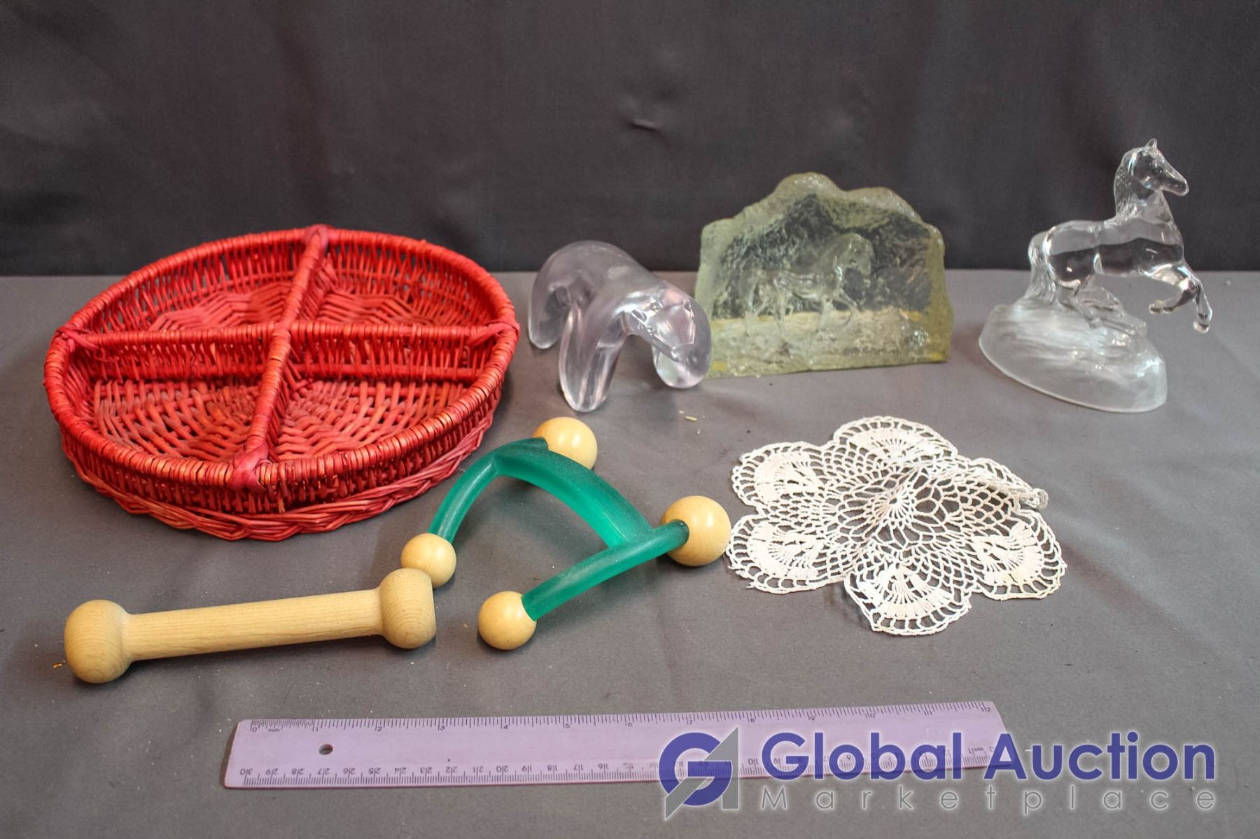 (2) Decorative Horse Figures, Polar Bear Figure, Wicker Tray, Massagers & Doily