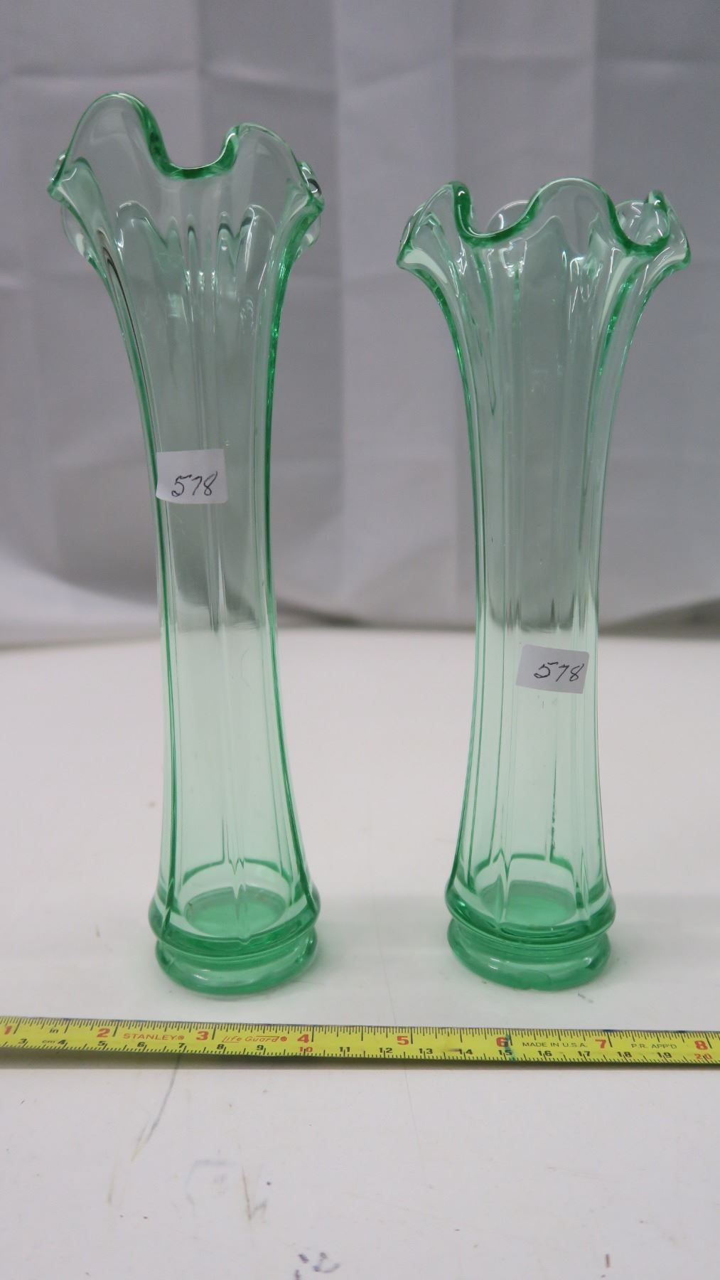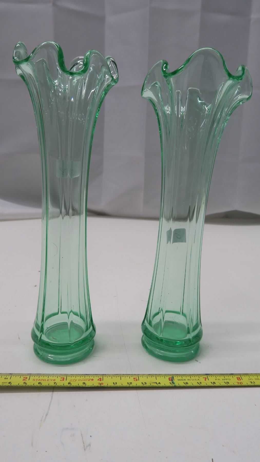 2 Depression Glass Vases 8 1/2”