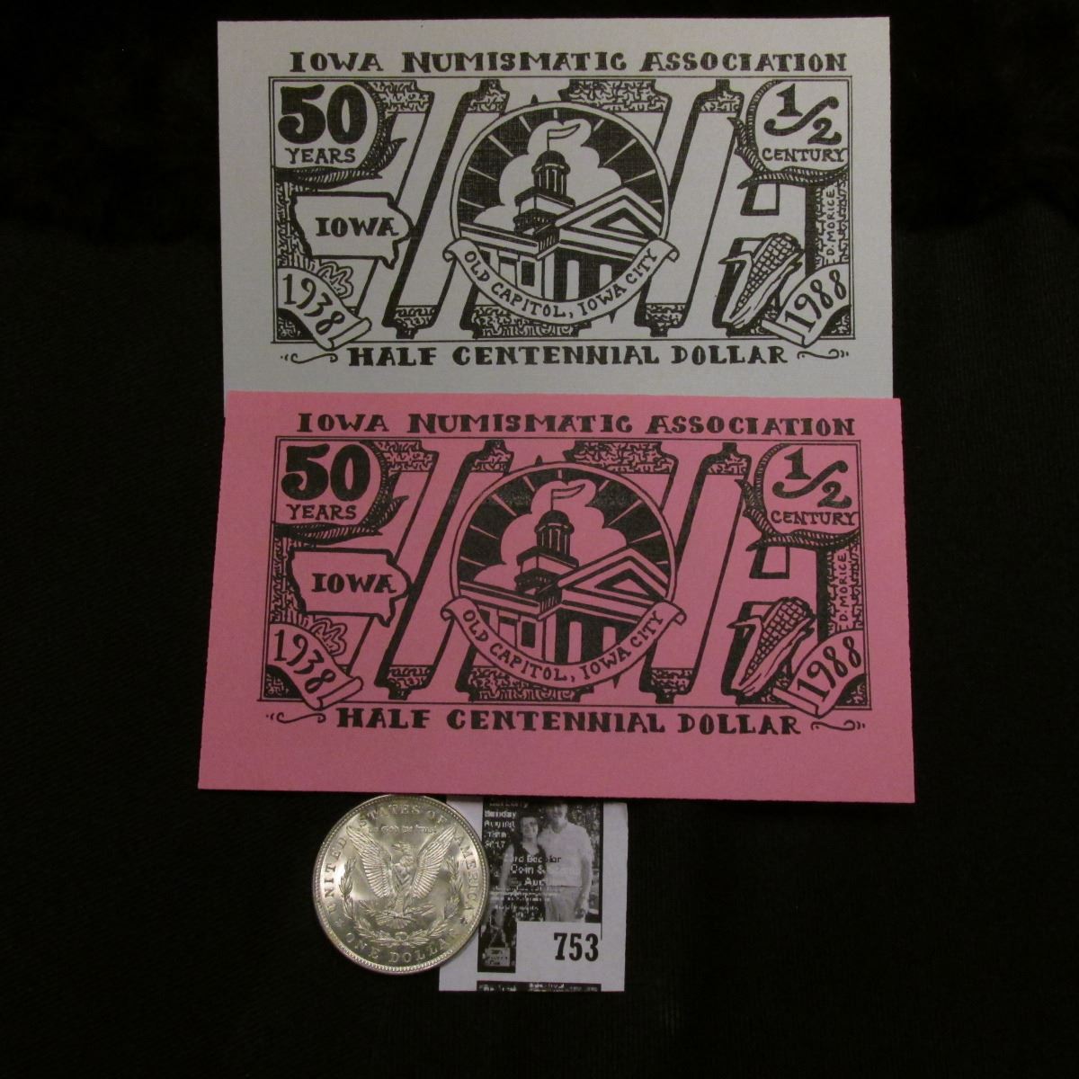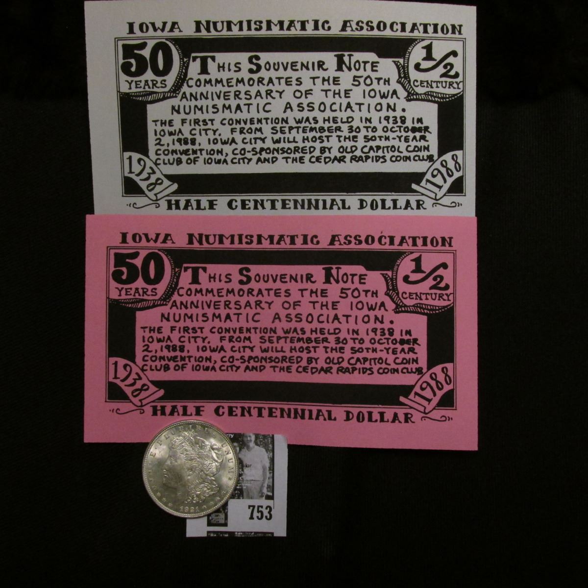 (2) Different 1938-1988 "Iowa Numismatic Association" Souvenir Note Half Centennial Dollar(s); & 1921 P U.S. Morgan Dollar in Gem BU.