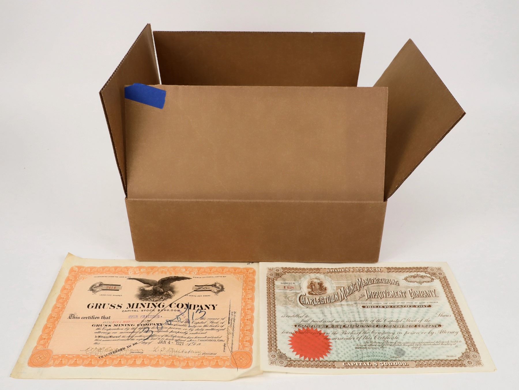 Charlestown Mining and Manufacturing, West Virginia, c.1880s unissued, about 150 pieces. Gruss Mining Company, Plumas County, California c.1930s about 300 issued certs.