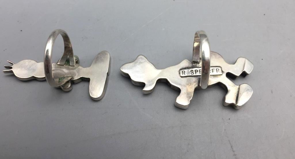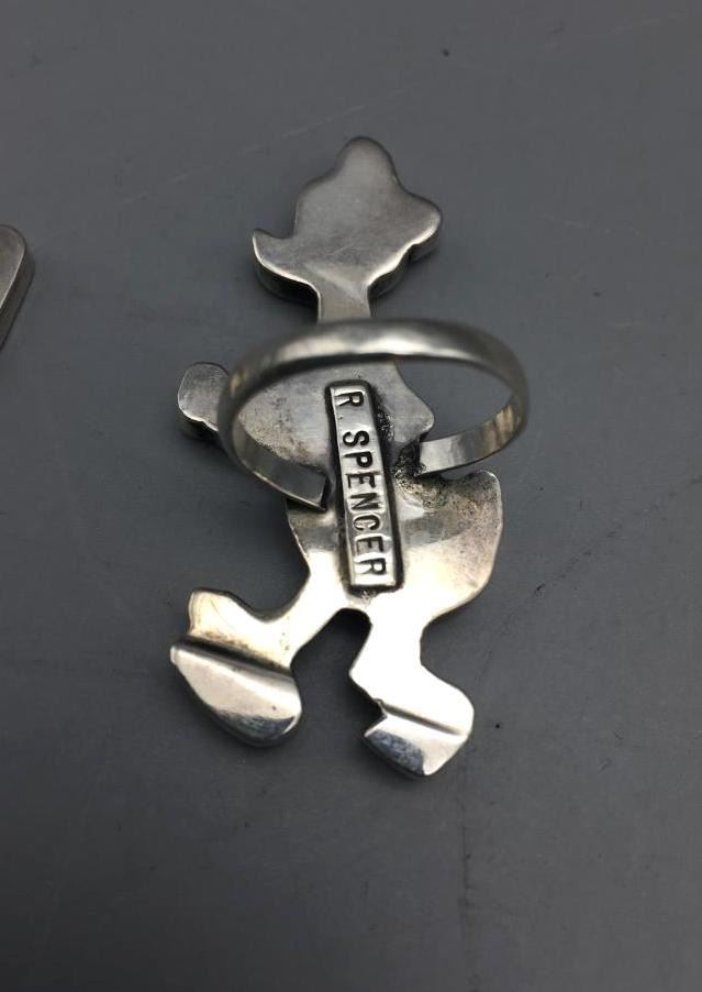 Description: For sale in this lot are two Disney themed rings. They are set with shell, onyx and turquoise inlays. Maker: One is hallmarked R. SPENCE, Navajo (active since the 1970s) and the other one is unmarked. Approx. Age: 1970s - 80s. Size: Various. Combined weight is 15.6 grams. Condition: Good for their ages, normal wear expected. Please look closely at the pictures - they are an important part of our description. Shipping: There will be a $5 handling / packaging fee for shipping this lot. The actual cost of postage will be added on top of that.