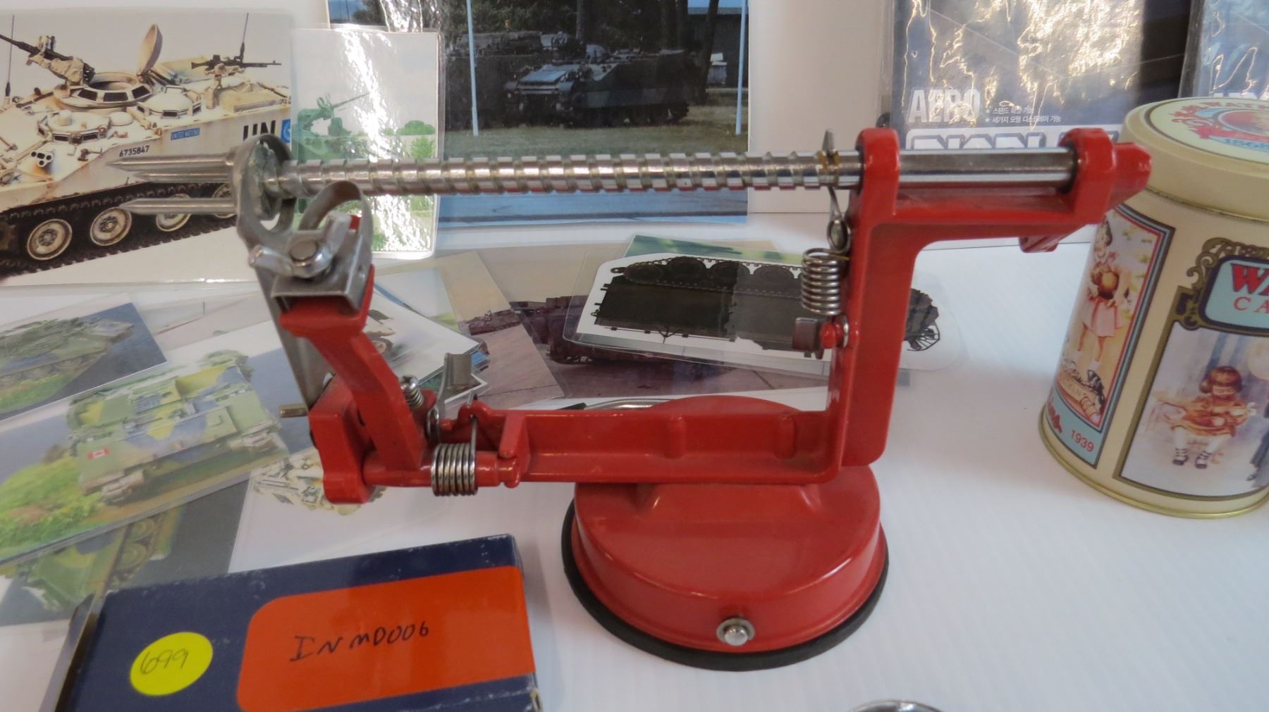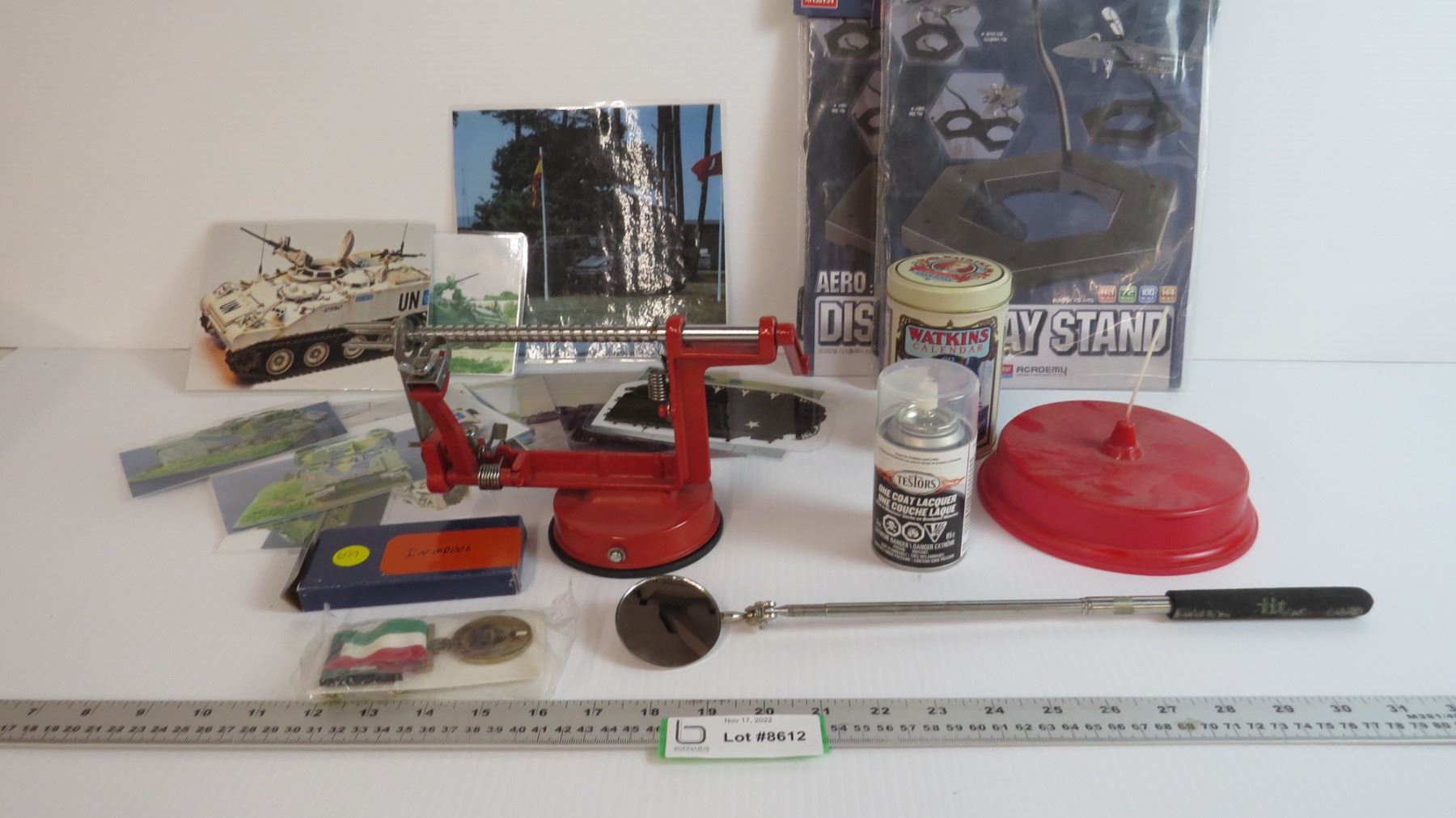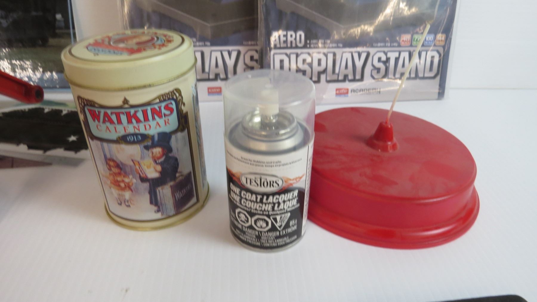 (2) Display Stands - Lacquer Spray Paint - WatkinsTin - Apple Peeler - Medal - Tank Photos