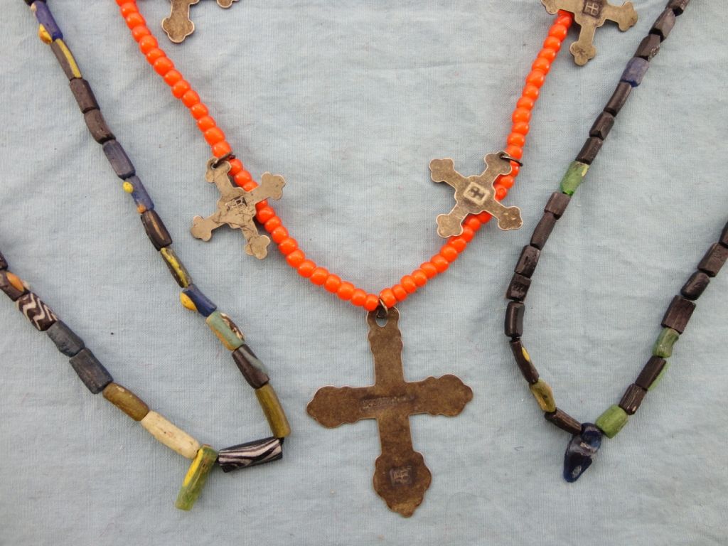 HB Marked trade silver necklace w/ 7 silver crosses & 2 small early trade bead necklaces.