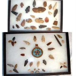 2 Displays of American Indian Points & Beaded Bag. Estimate $300-$400