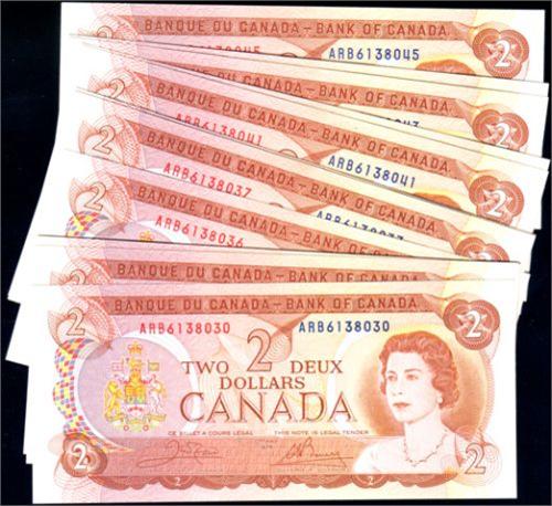 Bank of Canada Two Dollars 1974, Crow-Bouey, BC-47b Fifteen consecutive serial numbers, ARB6138030 to 8044, all Uncirculated