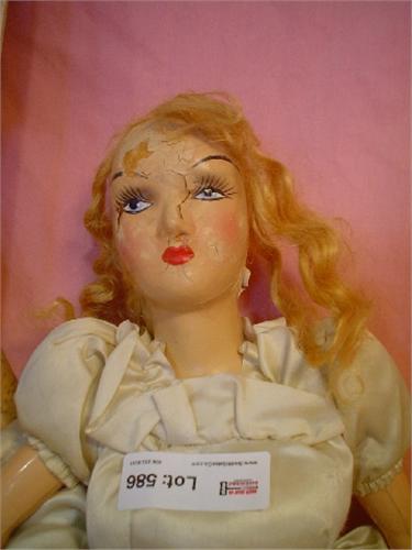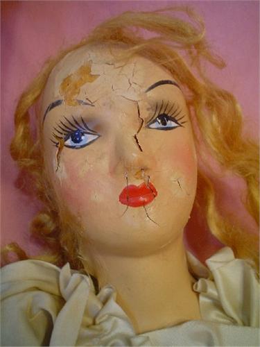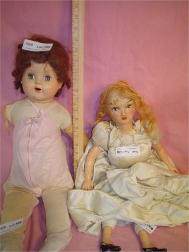 2 Dolls: 1)Bed Doll. Composition Head. Plastic Arms & Feet. Cloth Stuffed Body & Legs. (Cracks & Peeling on Head. Missing a lot of hair. Paint peeled on shoes & dress is ripped) Unmarked. 2)Cloth Stuffed Trunk & Stuffed Skin Legs & Arm (Missing Right Arm). 3)Composition Head. Working, moveable eyes. Unmarked. Sqwaks when rolled over (Rips & Tears in stuffed skin)