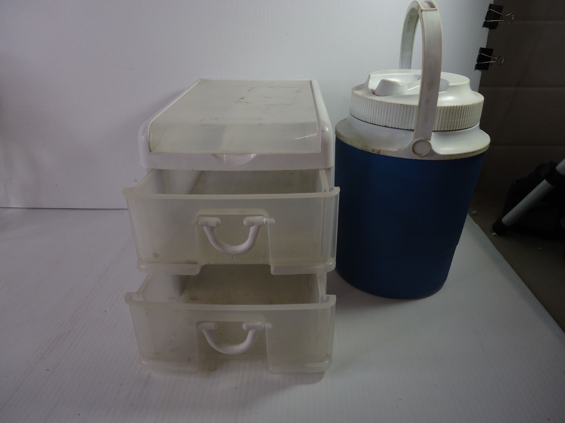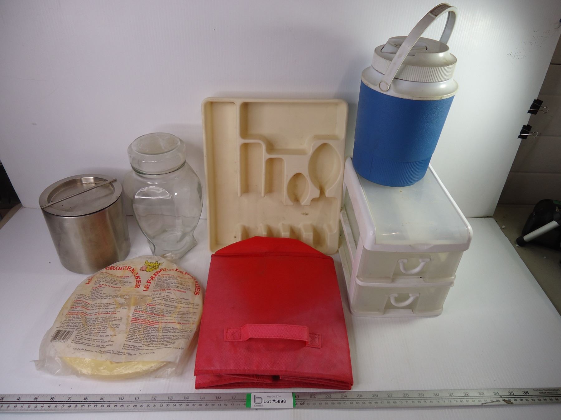 (2) Drawer Storage container, Rubbermaid Jug, Perogiemaker, Flatware Storage,(2) Storage Containers, Folding Storage Box