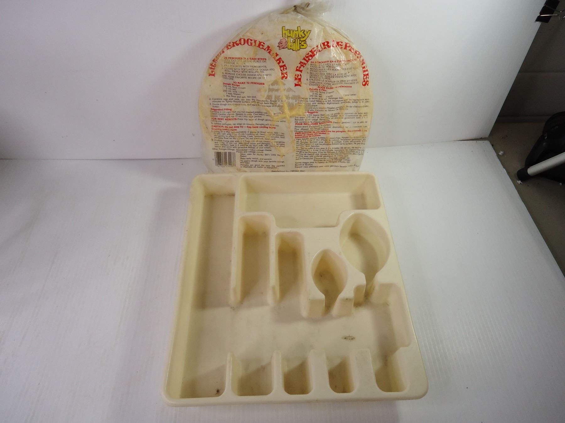 (2) Drawer Storage container, Rubbermaid Jug, Perogiemaker, Flatware Storage,(2) Storage Containers,