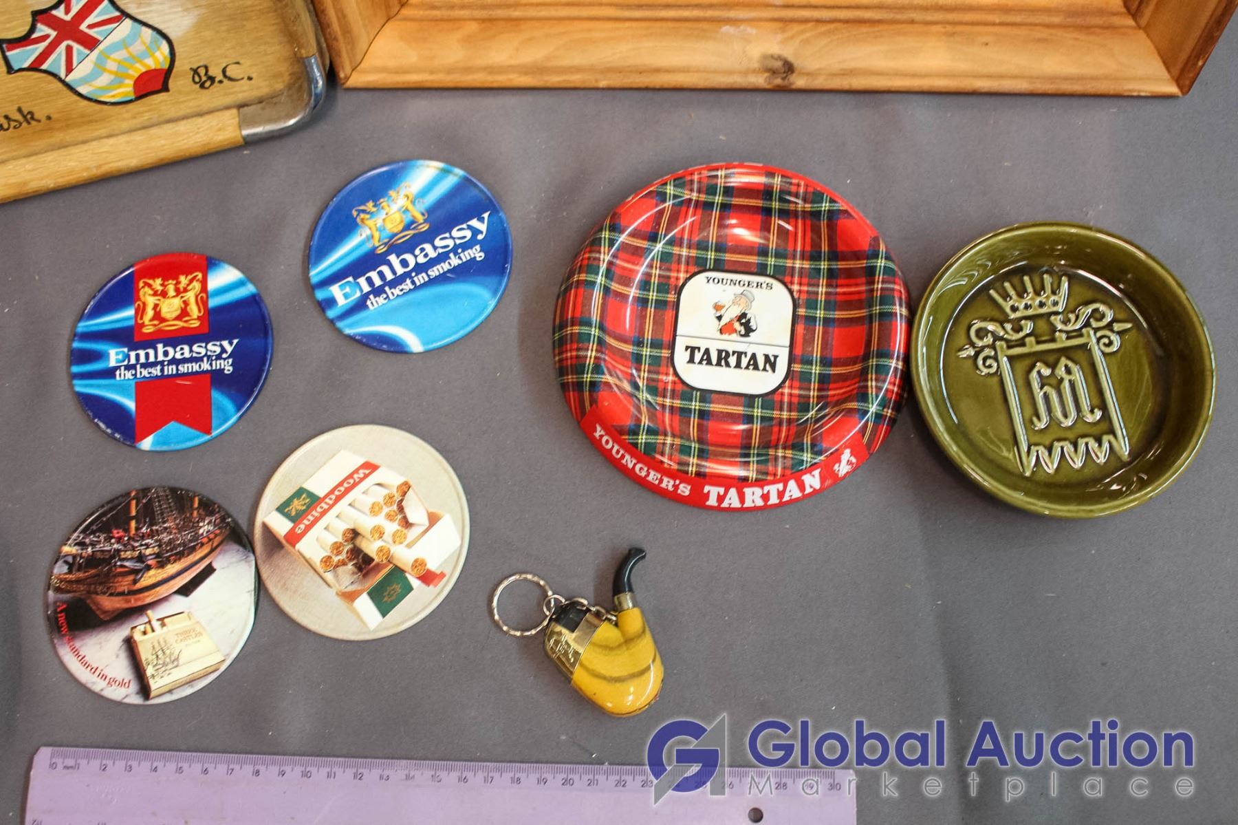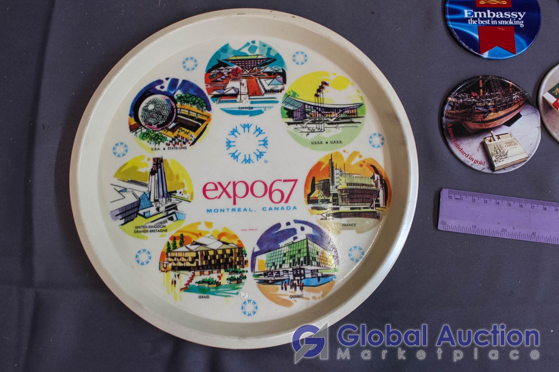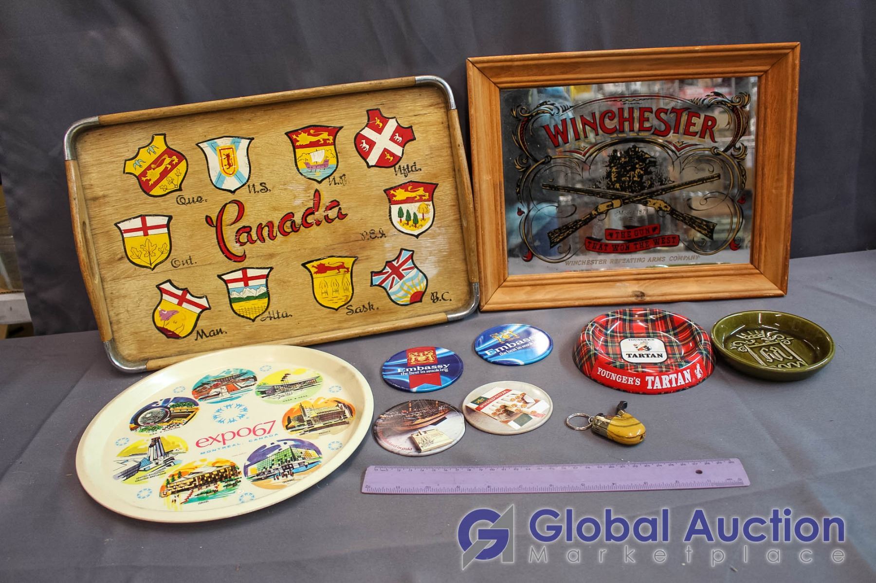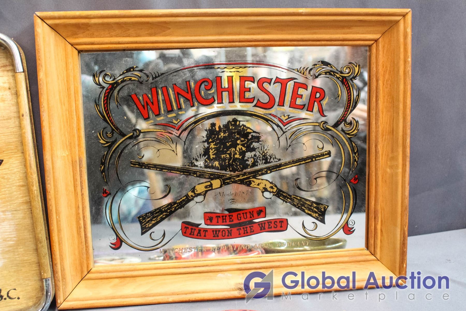 (2) Drink Trays, Coasters, Ash Trays and Framed Winchester Mirror Advertisement