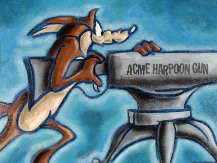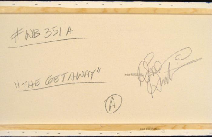 These 2 original paintings double the fun of a Road Runner chase! Artist Dick Duerrstein is an expert at cartoon art, and he has portrayed Wile E. Coyote with his ACME Harpoon Gun, and the Road Runner speeding along. If only the poor coyote realized, his leg is about to get tangled up in the rope!Title: "The Getaway"Medium: Acrylic paint on stretched canvas Signature: Signed by the artist on both, and on the versoOther markings: Artist name stamped on the verso Dimensions: Each is 18" x 36" Condition: Mint Hang these two side by side, and you'll have an exciting and humorous cartoon scene on your wall. Duerrstein's work can be found in the Walt Disney Studio corporate offices, Burbank, California; The Library of Congress, Washington, D.C. and St. Jude's Research Hospital in Memphis, Tennessee and private collections worldwide.