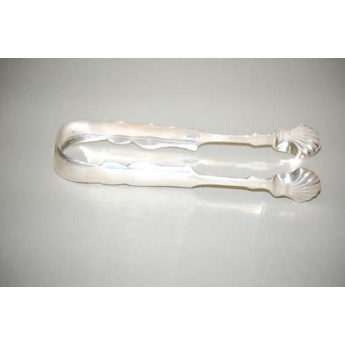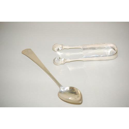(2) EARLY AMERICAN SILVER TABLE ITEMS - (1) PR. 6 1/4" WM. S. MORGAN POUGHKEEPSIE NY SHELL FORM SUGAR TONGS (MONOGRAM) & (1) 9 1/2" S & S WILSON PHILADELPHIA PA TABLESPOON (MONOGRAM)(4 TROY OZ.) - WEAR