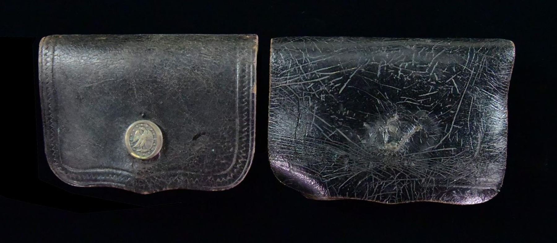 BOXES PICTURED IN "US MILITARY HOLSTER & RELATED ACCOUTREMENTS" BY EDWARD SCOTT MEADOWS. These holsters are pictured on page 635 of said book. These black bridle leather cartridge boxes contain 13 tin tubes for containing paper cartridges. Each box has 2 belt loops on back of bodies. 1) UNMARKED. Flap has hook on interior for latching to bracket on body of box. 2) UNMARKED. Flap has Militia button on exterior, interior has hook for loop on bottom of body. CONDITION: cartridges boxes intact with fair condition showing cracking & flexing of leather commensurate with age. Cartridge box #1 on back shows flaking of black finish & tears of lid along seam to body. PROVENANCE: The Collection of Edward Scott Meadows. (02-22154/MD). $600-1,000