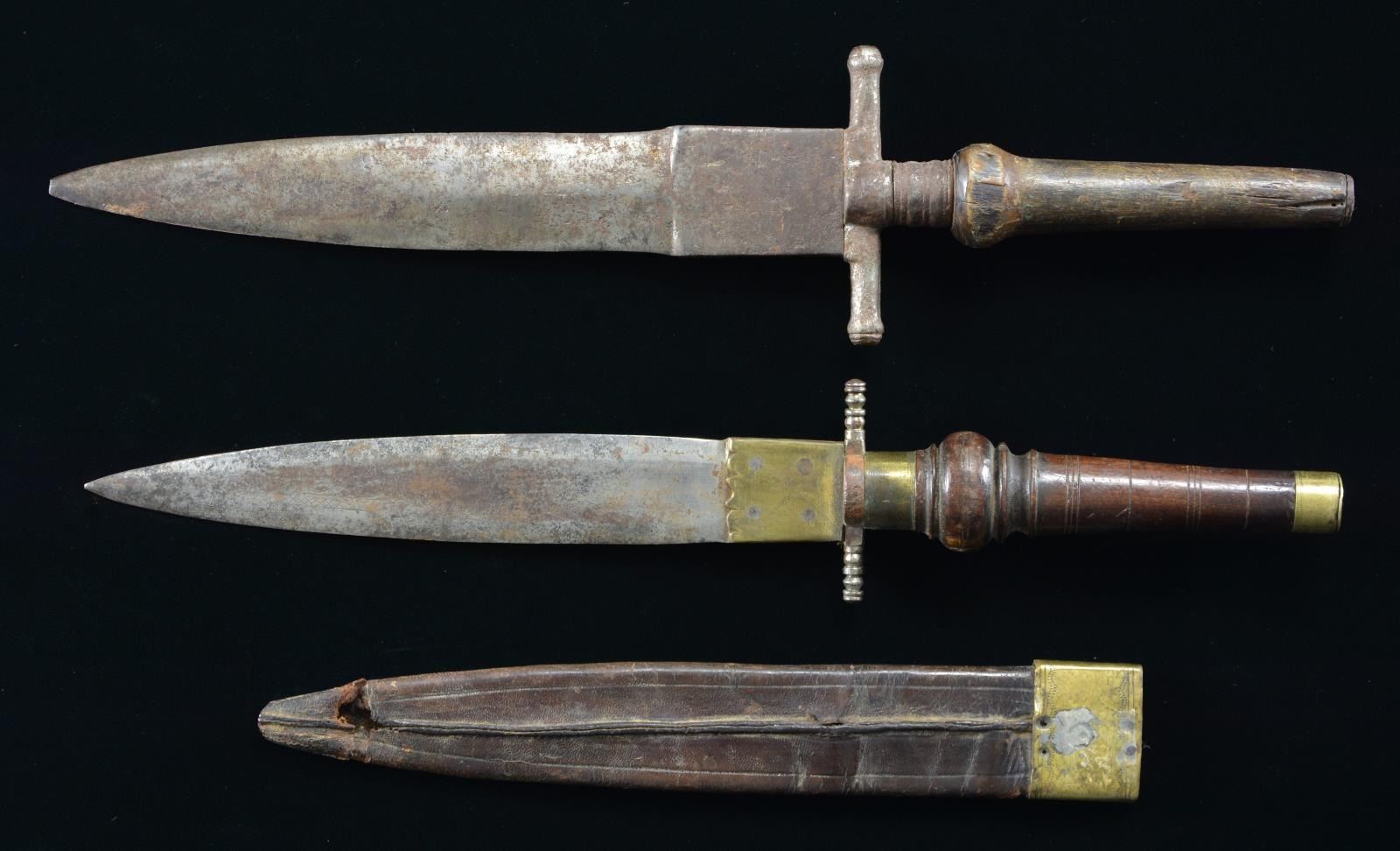 1) Overall length: 13". Blade length: 8". Plain blade with brass facings added at the ricasso. Turned steel crossguard with brass ferrule. Delicately turned wooden plug handle with brass pommel cap. Brass mounted leather scabbard. CONDITION: bayonet has a medium gray mottled patina. Brass has a mellow patina. Wood plug has a few chips to the more delicately turned areas. Scabbard is missing a frog stud and has a small break at the tip. 2) Overall length: 13 3/4". Blade length: 8 1/2". A heavy hand forged blade with slightly raised medial ridge. Iron crossguard & ferrule. Turned wooden plug handle with iron pommel cap. CONDITION: blade has a medium gray, mottled patina with areas of light pitting. Crossguard & ferrule have a dark overall patina. Wooden plug shows notable wear to the edges. PROVENANCE: From the Collection of James B. Taylor. (02-19871/BF). $700-1,000.