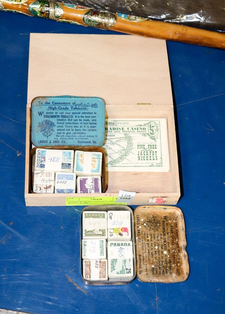 BUNDLED STAMPS AND 23 CASINO CERTIFICATES IN A CIGAR BOX. COLLECTIBLES