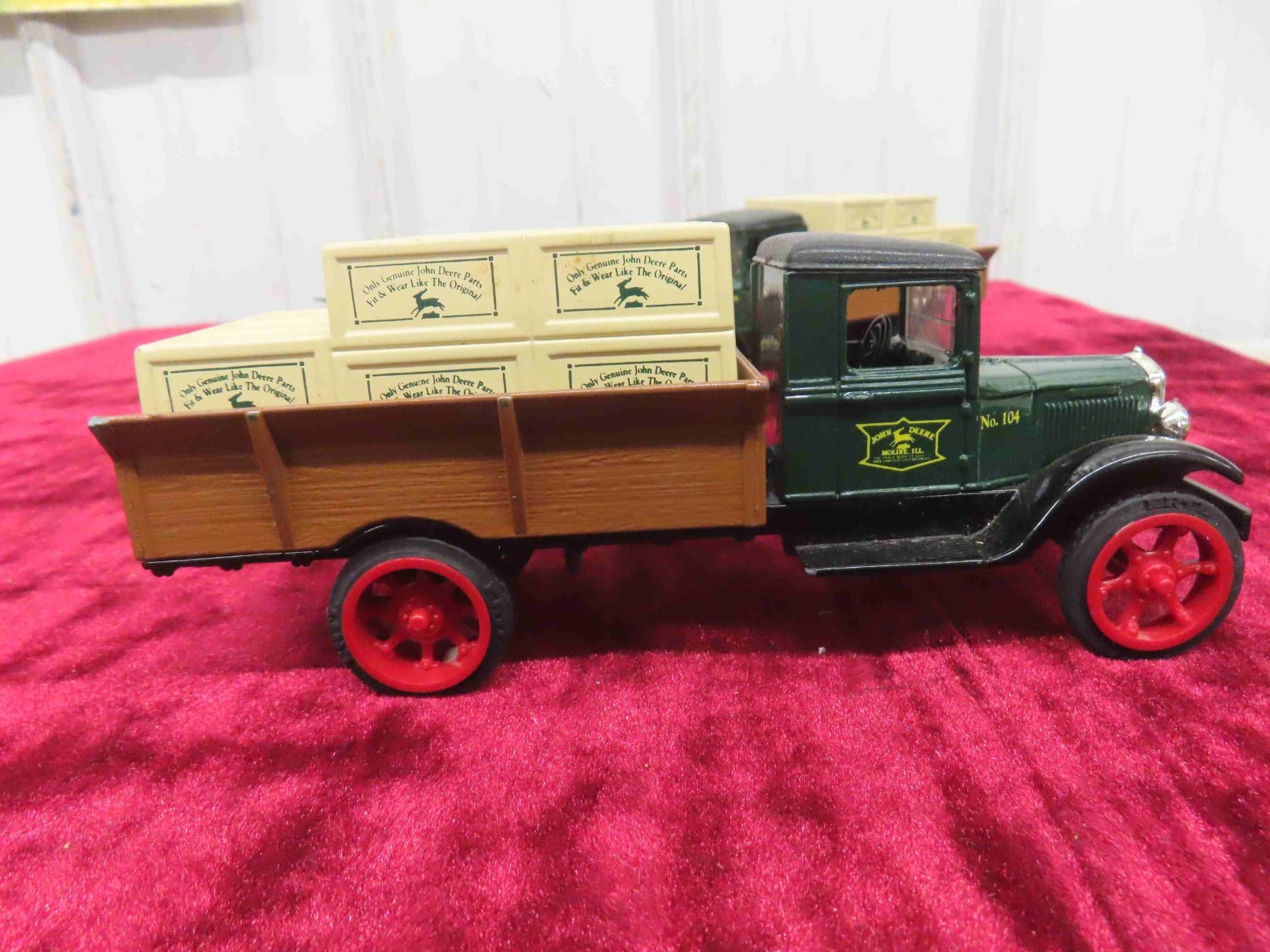 2 ERTL 1931 Hawkeye Die Cast Locking Coin Banks 1:25 Scale & 1940 Ford Pickup John Deere & John Deere Airplane 1" x 3.75" x 3.75"