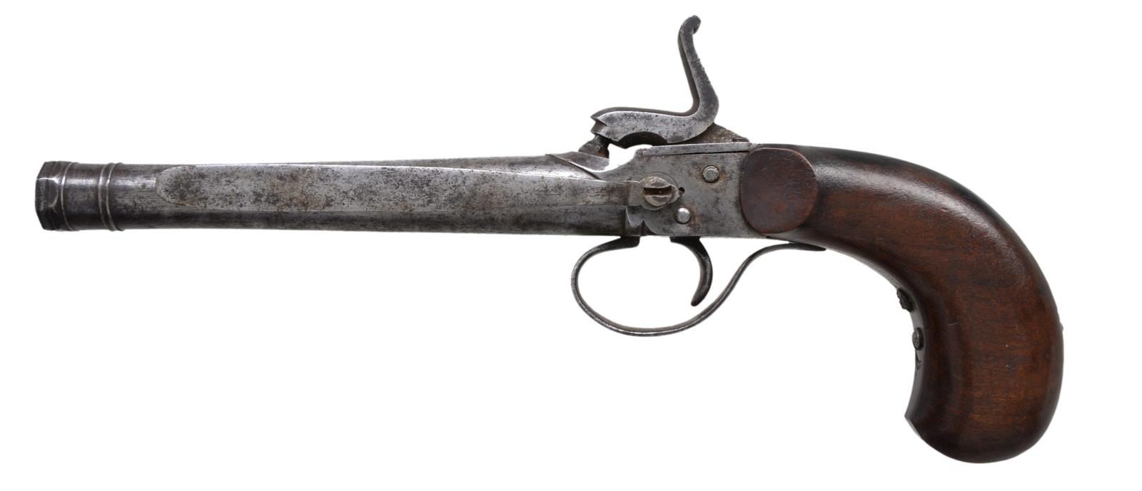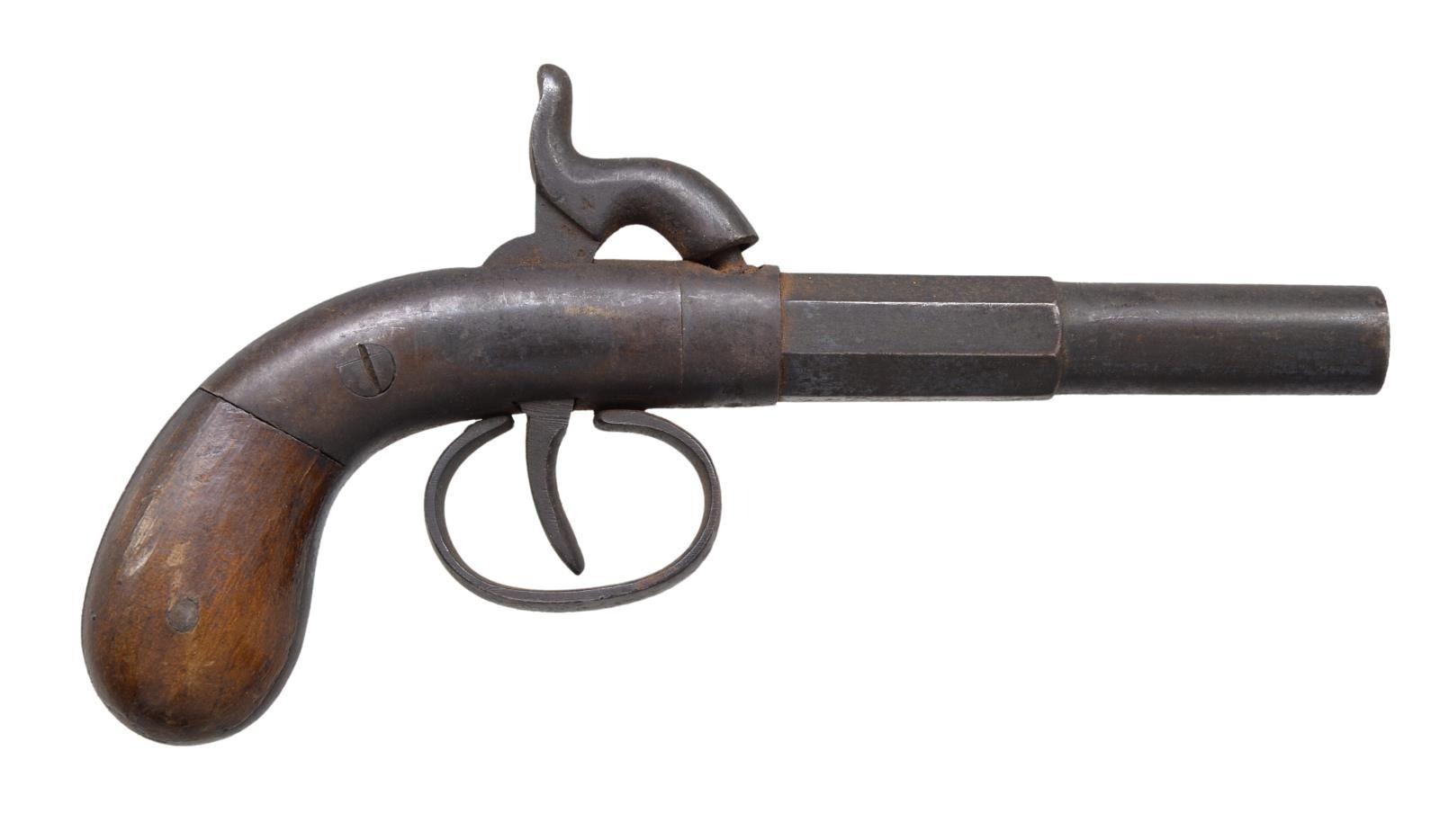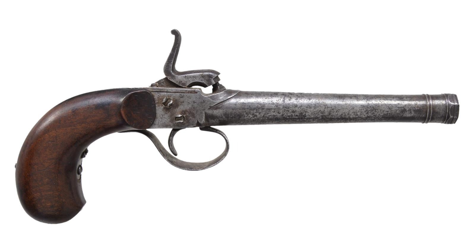 1) Cal. 45. NSN. Bbl. 6 1/4" rnd. w/ cannonade muzzle & smooth bore. Bbl. is integral w/ iron boxlock action. Center mounted hammer & trigger. Strap metal trigger guard. 1 Piece bird's head walnut grip. CONDITION: metal has cleaned gray appearance w/ scattered pitting. Hammer will not hold in cocked position. Grip shows wear & handling marks. Dark heavily pitted bore. 2) Cal. 31. NSN. Bbl. 3 1/2" rnd. w/ oct. shank & smooth bore. Rnd. boxlock action w/ center mounted hammer & trigger. Iron trigger guard. 2 Piece bag type grip. CONDITION: metal finish has faded to dark patina showing scattered spots of rust & surface corrosion. Grips show wear & handling marks. Sound action. Dark pitted bore. (01-18321(2)/DS). ALL ANTIQUE. $250-400.