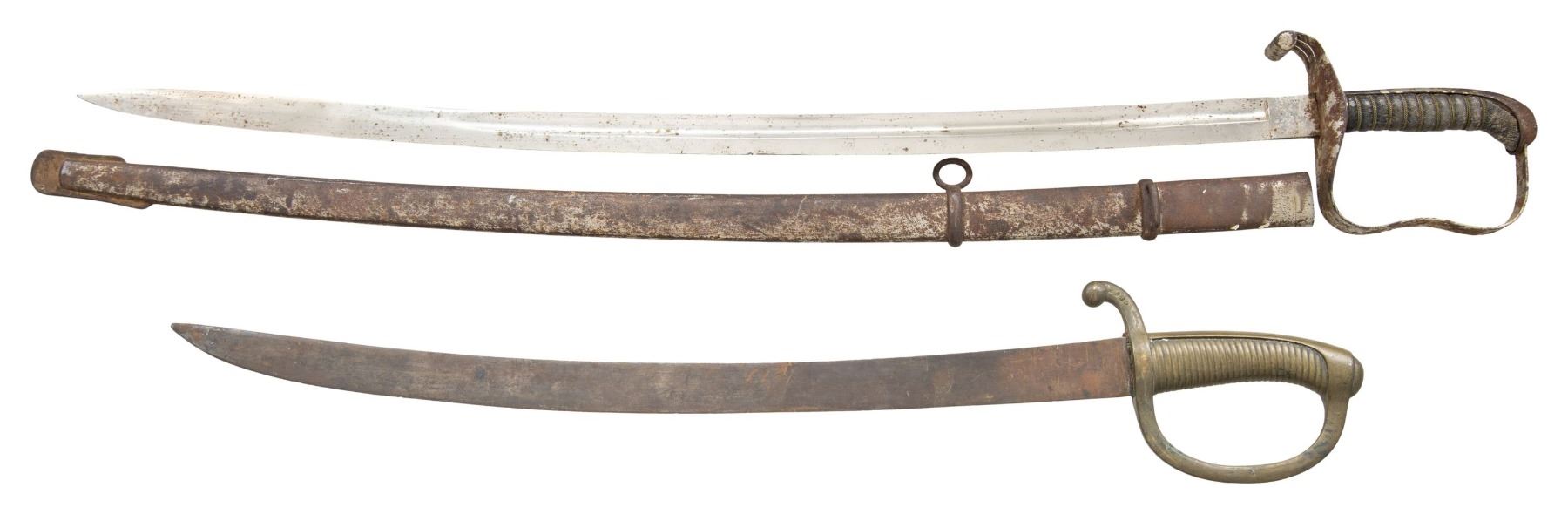 1) This sword may be of German origin and measures 36 1/2" overall with a 30" blade. The plain blade has a marking at the ricasso that appears to be German with the dates 1878-1898. Plain sheet iron guard with a wire wrapped sharkskin grip. Iron scabbard. CONDITION: blade shows scattered spotty corrosion, but the hilt and scabbard are more universally oxidized. Grip is better than 90% intact. 2) This is a standard infantry or artillery hanger used by many countries in Europe and first seen on the battlefields of the Napoleonic era with French troops. Overall length is 28 3/4" and the plain flat blade measures 23". Solid brass hilt and no scabbard. CONDITION: overall moderate wear. (02-24091/BF). NON-GUN. $200-400.