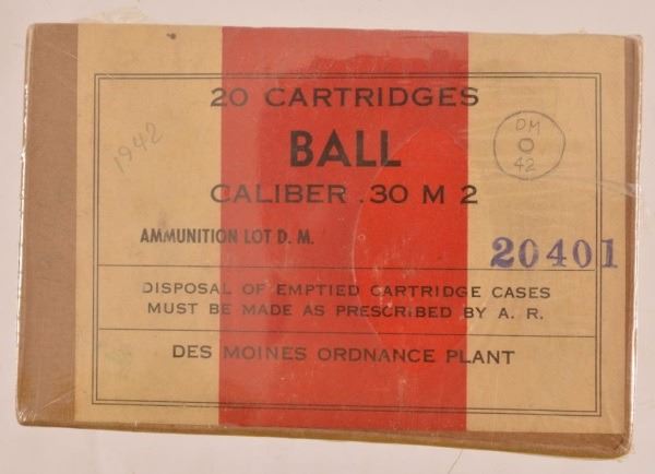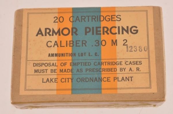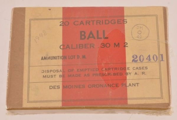1942 Box of .30 Caliber Ball Ammo. 20 cartridges. unopened. Early Box Of Lake City Ordinance .30 Ammo "Armor Piercing. 20 Count, box unopened.