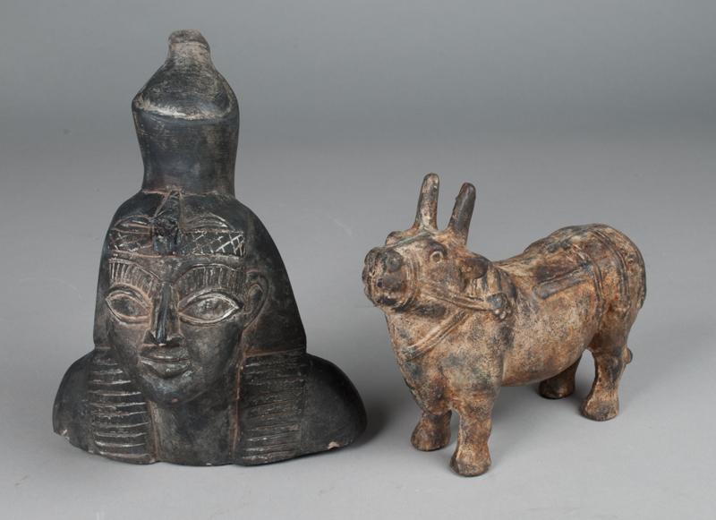 (2) Egyptian Style Figures, Bull, And Statue