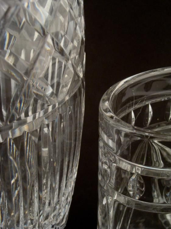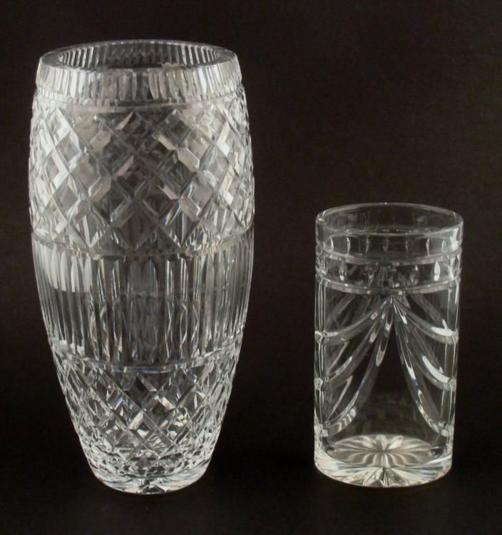 Here are two attractive glass vases. One is an 8" oval shaped vase with curved decoration. It is in very good condition, with light scratch marks on one side, inside. The other is a 13" tall round vase with vertical and crossed/diamond pattern. It is in excellent condition. * These vases will bring a bit of elegance to a floral display, or displayed on their own.