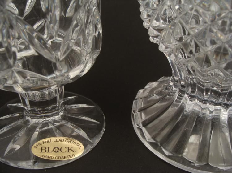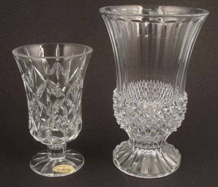 These are two attractive pressed glass vases, with different elegant patterns.Condition: ExcellentSize of small: 7" tall4" diameterSize of large: 9" tall5" diameterOne is Block 24% Lead Crystal *