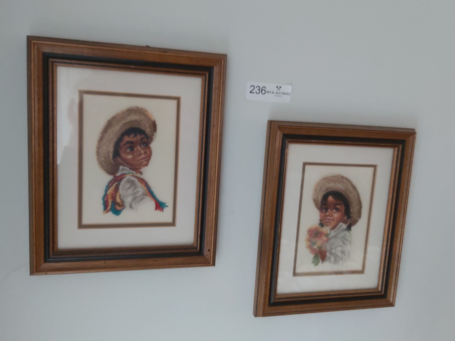 2 Embroidered Children in Frames 9 1/2" wide x 12" high