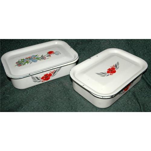Pair of Enameled Metal or Graniteware Kitchen Ice Box or Refrigerator Storage Boxes. They are both decorated with flowers on the lid and the sides. They measures 8 1/2 long x 6 3/4" wide and 2 1/4" deep. The lids are beveled. They are signed on the bottom. <p> The condition is good but show signs of wear.