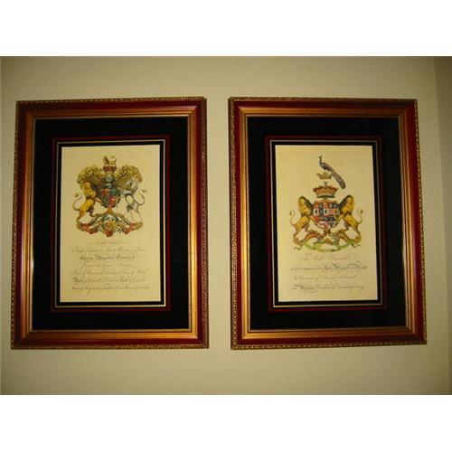 "Price Reduced" a pair of English Prints with an attractive gilt wood accented with black and red frame. they are decorative and collectible. in excellent condition, with slight imperfection a chip on one frame. the pictures are attractive with writings and crests. designer's delights! each measures 26 inch T. , 20 inch W, with 1.5 inch depth. appears to be the writings are to the British Prince..