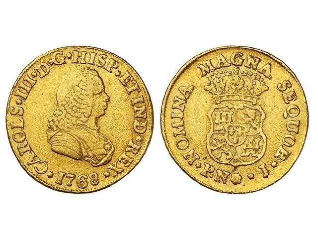 2 Escudos. 1768. POPAYÁN. J. Busto de Fernando VI. (Pequeños golpecitos). ESCASA. Cal-498. MBC-.