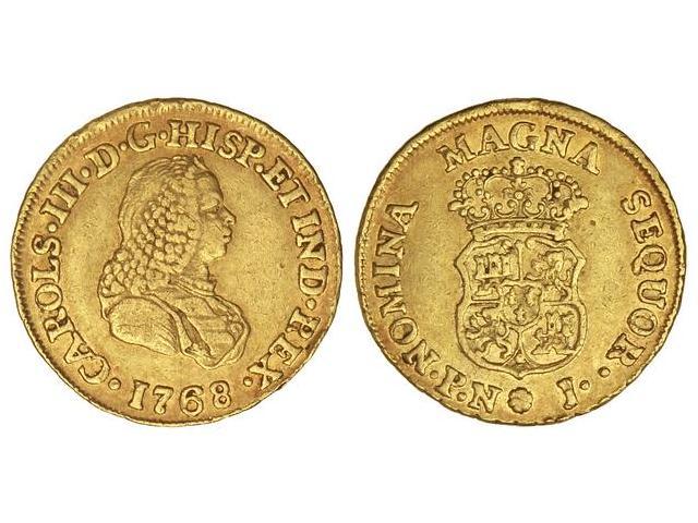 2 Escudos. 1768. POPAYÁN. J. (Pequeños golpecitos y rayas). Cal-498. MBC-.