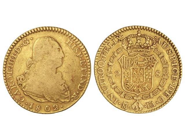 2 Escudos. 1802/1. MADRID. F.A. (Probablemente ha estado colgada. Pequeñas rayitas en anverso). Cal-344 var. BC+/MBC-.