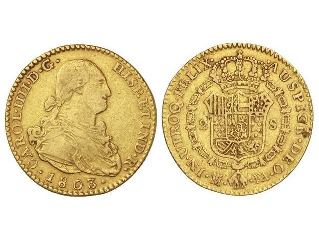 2 Escudos. 1803. MADRID. F.A. Cordoncillo irregular en canto. (Pequeños golpecitos y hojitas en reverso). Cal-345. MBC-.