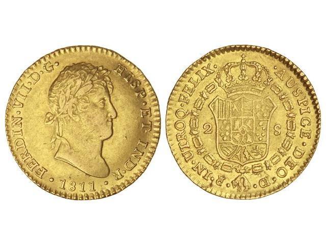 2 Escudos. 1811. CÁDIZ. C.I. Restos de brillo original. Ceca pequeña. Cospel algo doblado. (Pequeñas hojitas). Cal-177. MBC+.
