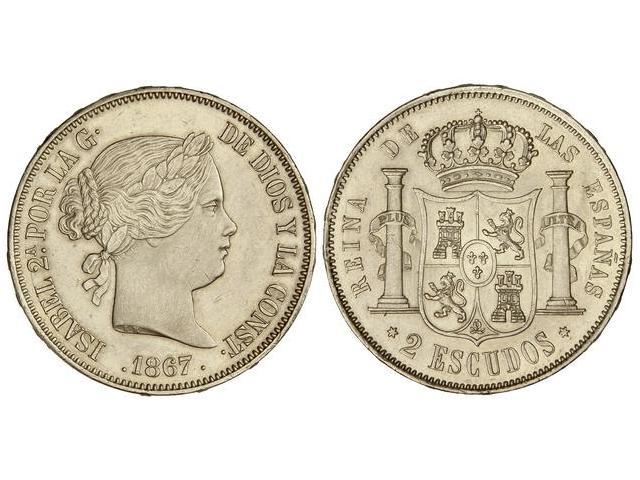 2 Escudos. - 1867. - MADRID. - (Rayitas de limpieza en anverso. Pequeños golpecitos). Cal-204. EBC. - -