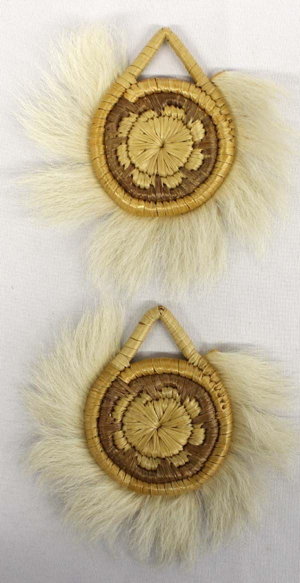 2 Native American Northwest Coast Eskimo Fur, Leather, and Basketry Dance Fans, measure 4.5'' x 5'', small v-shaped handle